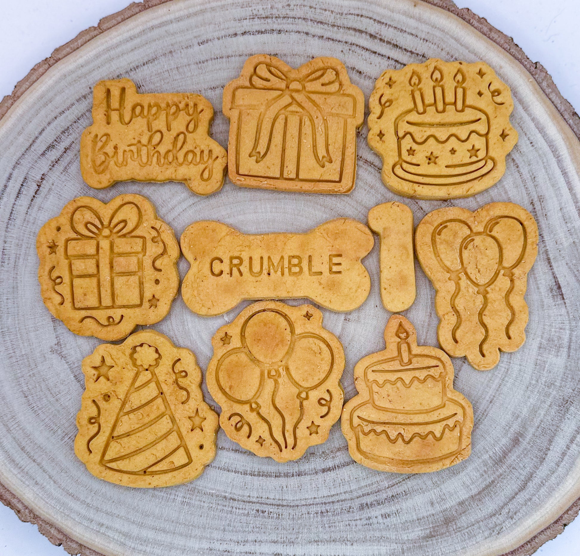 This box contains 10 large biscuits in personalised birthday packaging - the biscuits are Peanut Butter and Sweet potato Flavour and the box will include 8 birthday themed biscuits, a personalised biscuit with your dogs name on and a number biscuit for their age - Your dog will also receive a birthday card from us here at Bailey’s bakes and cakes❤️