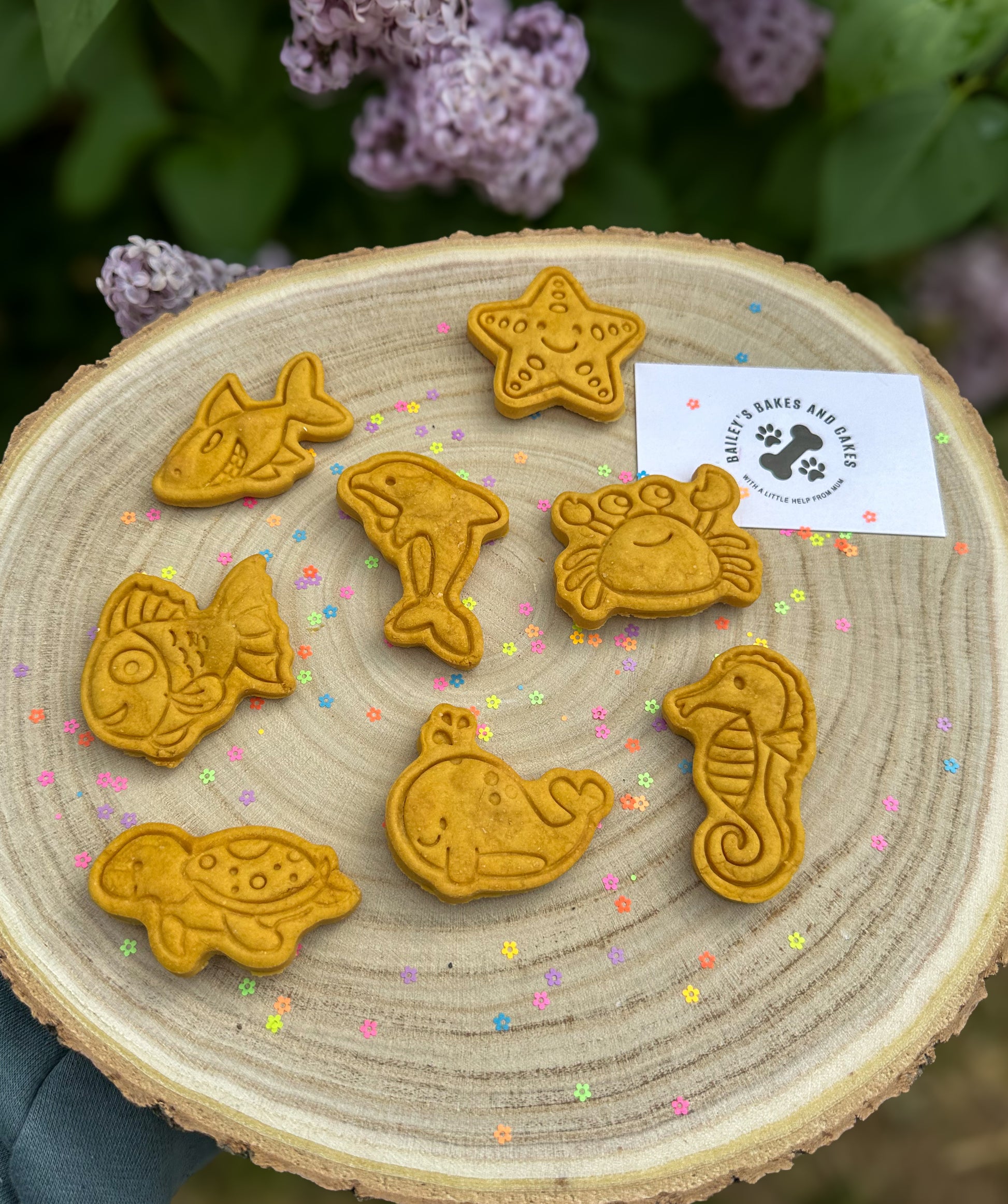 In each bag you will receive 8 Sea creature shaped biscuits in sweet potato and peanut butter flavour 🐠🐳