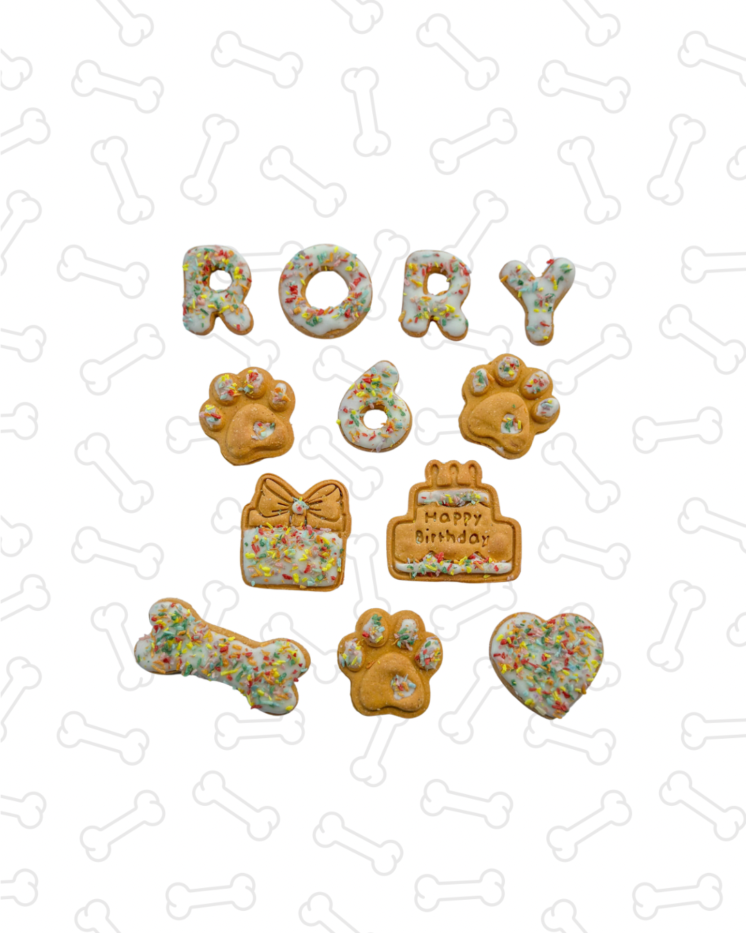 Each set comes with 3 Iced paw prints, 1 Iced Present, 1 Iced Birthday Cake, 1 Iced bone, 1 Iced Heart, 1 iced Number and your dogs name spelt in individual biscuits.